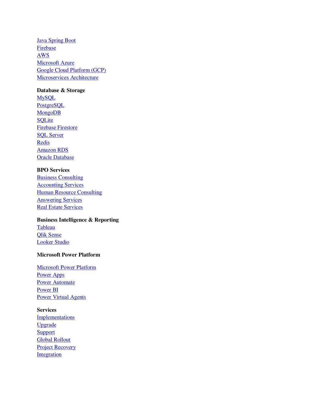 Java Spring Boot Firebase AWS Microsoft Azure Google Cloud Platform (GCP) Microservices Architecture Database & Storage MySQL PostgreSQL MongoDB SQLite Firebase Firestore SQL Server Redis Amazon RDS Oracle Database BPO Services Business Consulting Accounting Services Human Resource Consulting Answering Services Real Estate Services Business Intelligence & Reporting Tableau Qlik Sense Looker Studio Microsoft Power Platform Microsoft Power Platform Power Apps Power Automate Power BI Power Virtual Agents Services Implementations Upgrade Support Global Rollout Project Recovery Integration