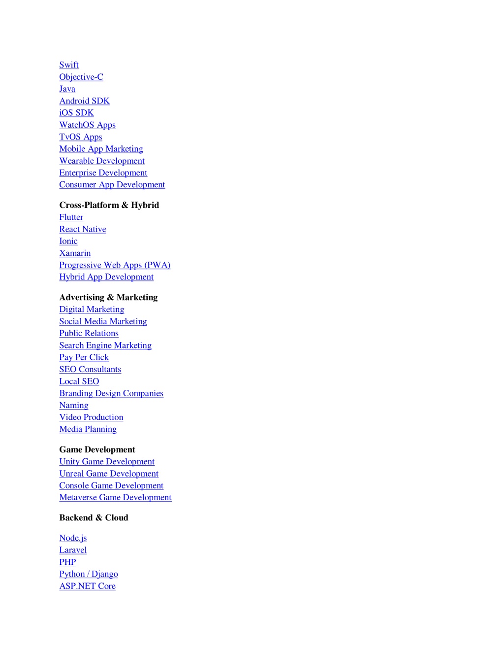 Swift Objective-C Java Android SDK iOS SDK WatchOS Apps TvOS Apps Mobile App Marketing Wearable Development Enterprise Development Consumer App Development Cross-Platform & Hybrid Flutter React Native Ionic Xamarin Progressive Web Apps (PWA) Hybrid App Development Advertising & Marketing Digital Marketing Social Media Marketing Public Relations Search Engine Marketing Pay Per Click SEO Consultants Local SEO Branding Design Companies Naming Video Production Media Planning Game Development Unity Game Development Unreal Game Development Console Game Development Metaverse Game Development Backend & Cloud Node.js Laravel PHP Python / Django ASP.NET Core
