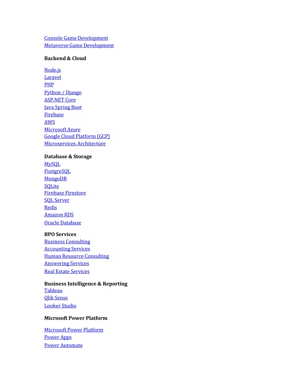 ConsoleGameDevelopmentMetaverseGameDevelopment Backend&Cloud Node.jsLaravelPHP Python/ DjangoASP.NETCore JavaSpring BootFirebase AWS MicrosoftAzure GoogleCloudPlatform(GCP)MicroservicesArchitecture Database&Storage MySQL PostgreSQLMongoDB SQLite FirebaseFirestoreSQLServer RedisAmazonRDS OracleDatabase BPO Services BusinessConsultingAccountingServices HumanResourceConsultingAnswering Services RealEstateServices BusinessIntelligence&Reporting TableauQlik Sense LookerStudio MicrosoftPower Platform MicrosoftPowerPlatformPowerApps Power Automate