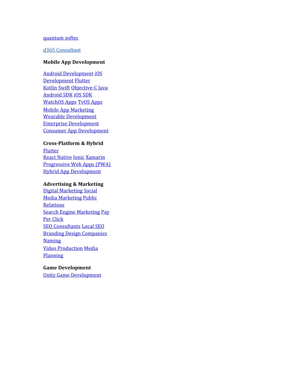 quantumsoftec d365Consultant MobileAppDevelopment AndroidDevelopmentiOSDevelopmentFlutter KotlinSwiftObjective-CJava AndroidSDKiOSSDK WatchOSAppsTvOSApps MobileAppMarketing WearableDevelopmentEnterpriseDevelopmentConsumerAppDevelopment Cross-Platform&Hybrid Flutter ReactNativeIonicXamarin ProgressiveWebApps(PWA)HybridAppDevelopment Advertising&Marketing DigitalMarketingSocialMediaMarketingPublicRelations SearchEngineMarketingPayPerClick SEOConsultantsLocalSEO BrandingDesignCompaniesNaming VideoProductionMediaPlanning GameDevelopment UnityGameDevelopment