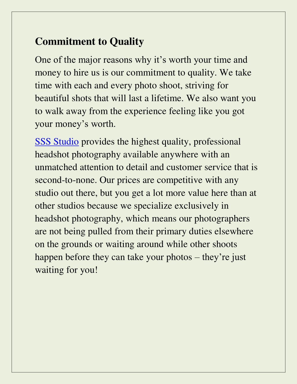 Commitment to Quality One of the major reasons why it’s worth your time and money to hire us is our commitment to quality. We take time with each and every photo shoot, striving for beautiful shots that will last a lifetime. We also want you to walk away from the experience feeling like you got your money’s worth. SSS Studio provides the highest quality, professional headshot photography available anywhere with an unmatched attention to detail and customer service that is second-to-none. Our prices are competitive with any studio out there, but you get a lot more value here than at other studios because we specialize exclusively in headshot photography, which means our photographers are not being pulled from their primary duties elsewhere on the grounds or waiting around while other shoots happen before they can take your photos –they’re just waiting for you!