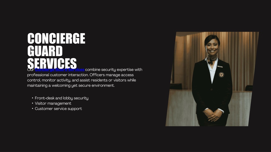 CONCIERGE GUARD SERVICES Our Concierge Guard Services combine security expertise with professional customer interaction. Officers manage access control, monitor activity, and assist residents or visitors while maintaining a welcoming yet secure environment. • Front-desk and lobby security • Visitor management • Customer service support
