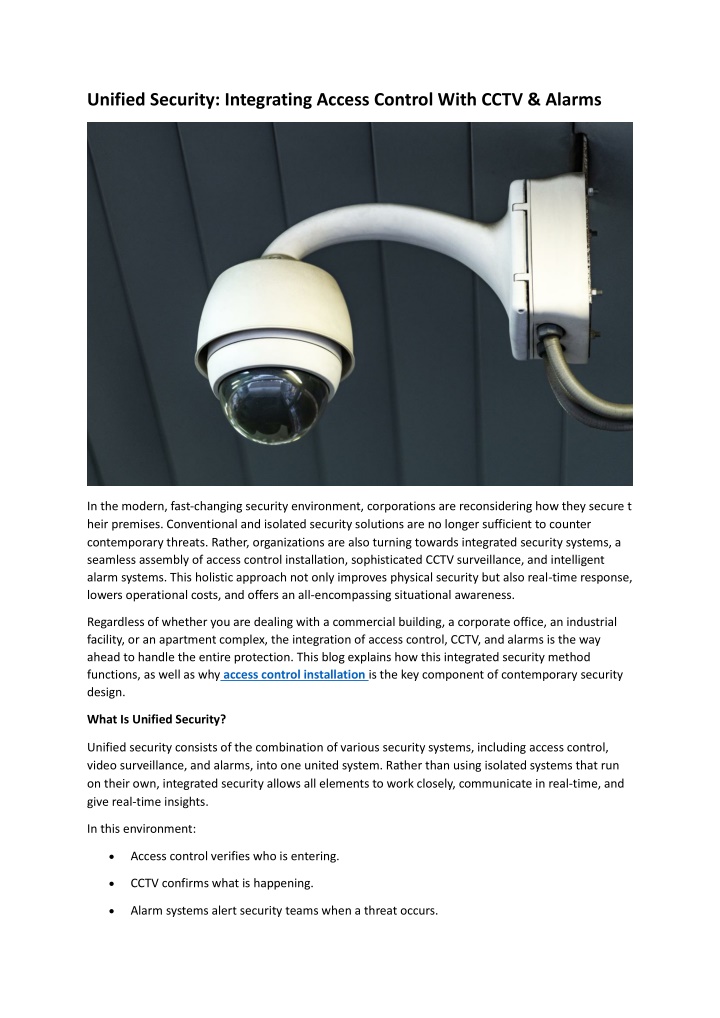 Unified Security: Integrating Access Control With CCTV & Alarms In the modern, fast-changing security environment, corporations are reconsidering how they secure t heir premises. Conventional and isolated security solutions are no longer sufficient to counter contemporary threats. Rather, organizations are also turning towards integrated security systems, a seamless assembly of access control installation, sophisticated CCTV surveillance, and intelligent alarm systems. This holistic approach not only improves physical security but also real-time response, lowers operational costs, and offers an all-encompassing situational awareness. Regardless of whether you are dealing with a commercial building, a corporate office, an industrial facility, or an apartment complex, the integration of access control, CCTV, and alarms is the way ahead to handle the entire protection. This blog explains how this integrated security method functions, as well as why access control installation is the key component of contemporary security design. What Is Unified Security? Unified security consists of the combination of various security systems, including access control, video surveillance, and alarms, into one united system. Rather than using isolated systems that run on their own, integrated security allows all elements to work closely, communicate in real-time, and give real-time insights. In this environment: • Access control verifies who is entering. • CCTV confirms what is happening. • Alarm systems alert security teams when a threat occurs.