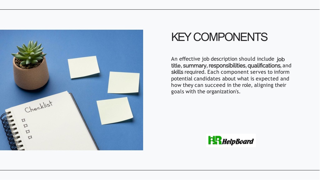 KEYCOMPONENTS Aneffectivejobdescriptionshouldinclude ,,,,and required.Eachcomponentservestoinform potentialcandidatesaboutwhatisexpectedand howtheycansucceedintherole,aligningtheir goalswiththeorganization's.