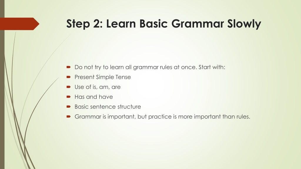3. Step 2: Learn Basic Grammar Slowly • Do not try to learn all grammar rules at once. Start with: • Present Simple Tense • Use of is, am, are • Has and have • Basic sentence structure • Grammar is important, but practice is more important than rules.