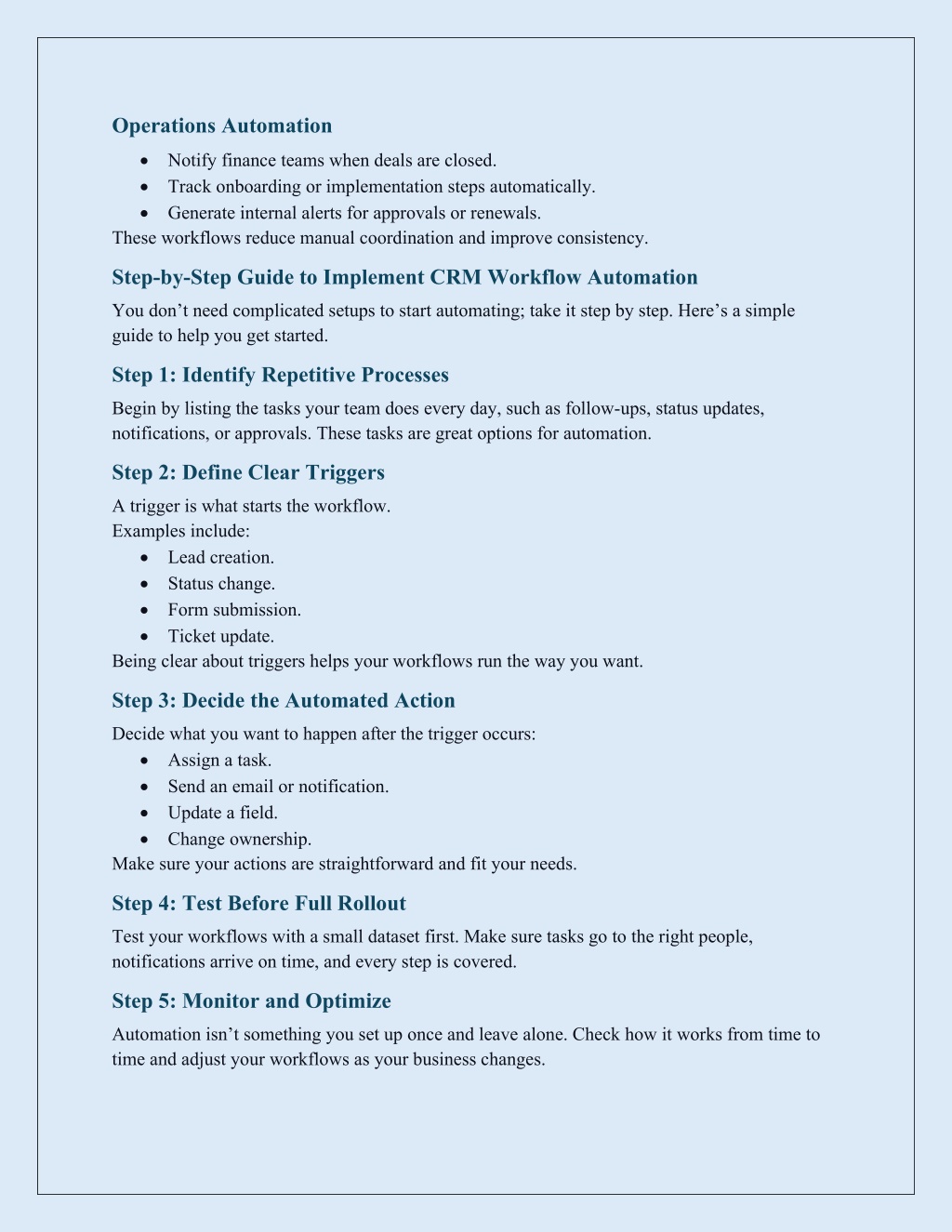 Operations Automation •Notify finance teams when deals are closed. •Track onboarding or implementation steps automatically. •Generate internal alerts for approvals or renewals. These workflows reduce manual coordination and improve consistency. Step-by-Step Guide to Implement CRM Workflow Automation You don’t need complicated setups to start automating; take it step by step. Here’s a simple guide to help you get started. Step 1: Identify Repetitive Processes Begin by listing the tasks your team does every day, such as follow-ups, status updates, notifications, or approvals. These tasks are great options for automation. Step 2: Define Clear Triggers A trigger is what starts the workflow. Examples include: •Lead creation. •Status change. •Form submission. •Ticket update. Being clear about triggers helps your workflows run the way you want. Step 3: Decide the Automated Action Decide what you want to happen after the trigger occurs: •Assign a task. •Send an email or notification. •Update a field. •Change ownership. Make sure your actions are straightforward and fit your needs. Step 4: Test Before Full Rollout Test your workflows with a small dataset first. Make sure tasks go to the right people, notifications arrive on time, and every step is covered. Step 5: Monitor and Optimize Automation isn’t something you set up once and leave alone. Check how it works from time to time and adjust your workflows as your business changes.