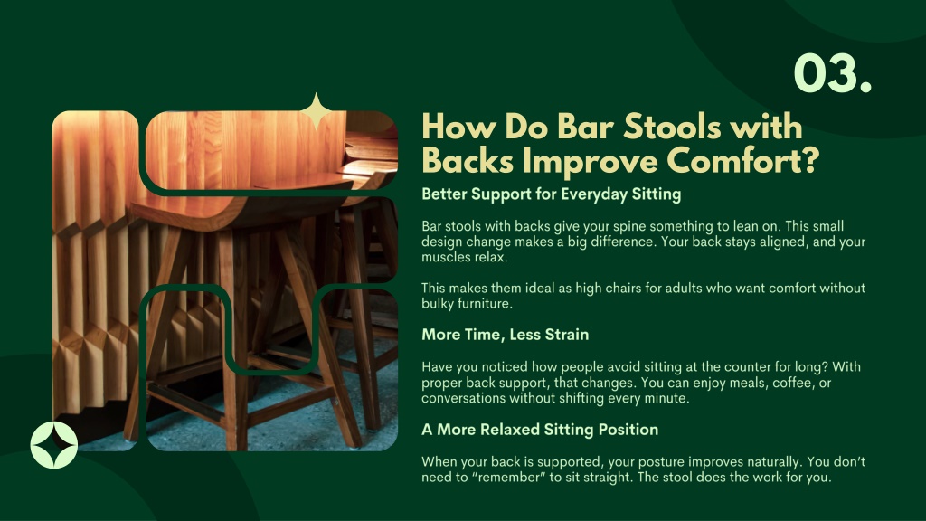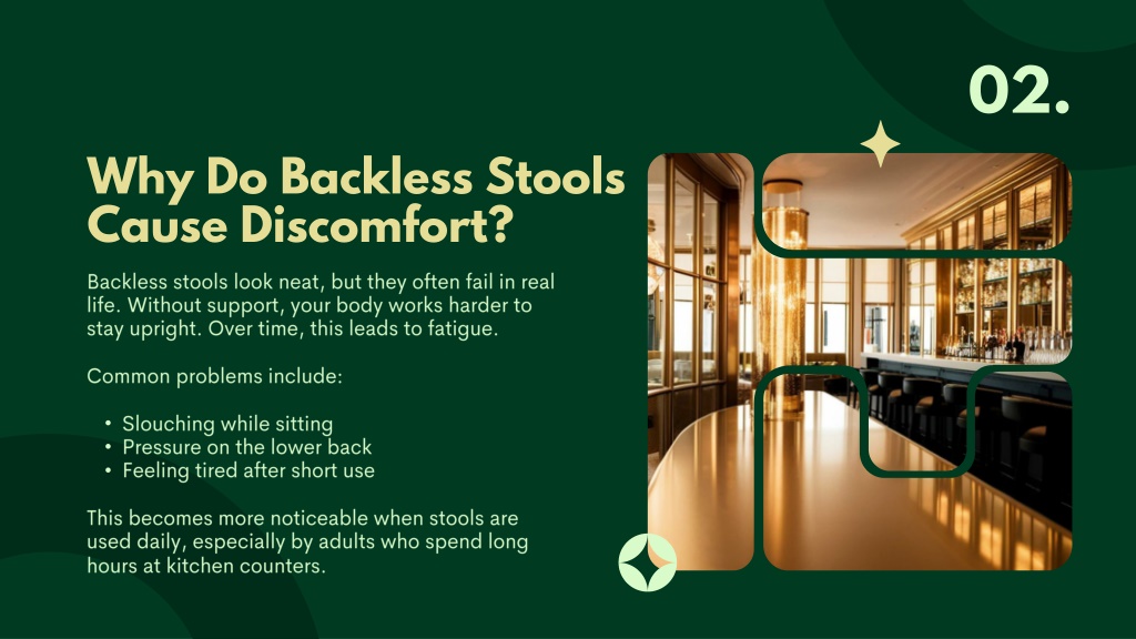 02. Why Do Backless Stools Cause Discomfort? • Backless stools look neat, but they often fail in real life. Without support, your body works harder to stay upright. Over time, this leads to fatigue. • Common problems include: • Slouching while sitting • Pressure on the lower back • Feeling tired after short use • This becomes more noticeable when stools are used daily, especially by adults who spend long hours at kitchen counters.