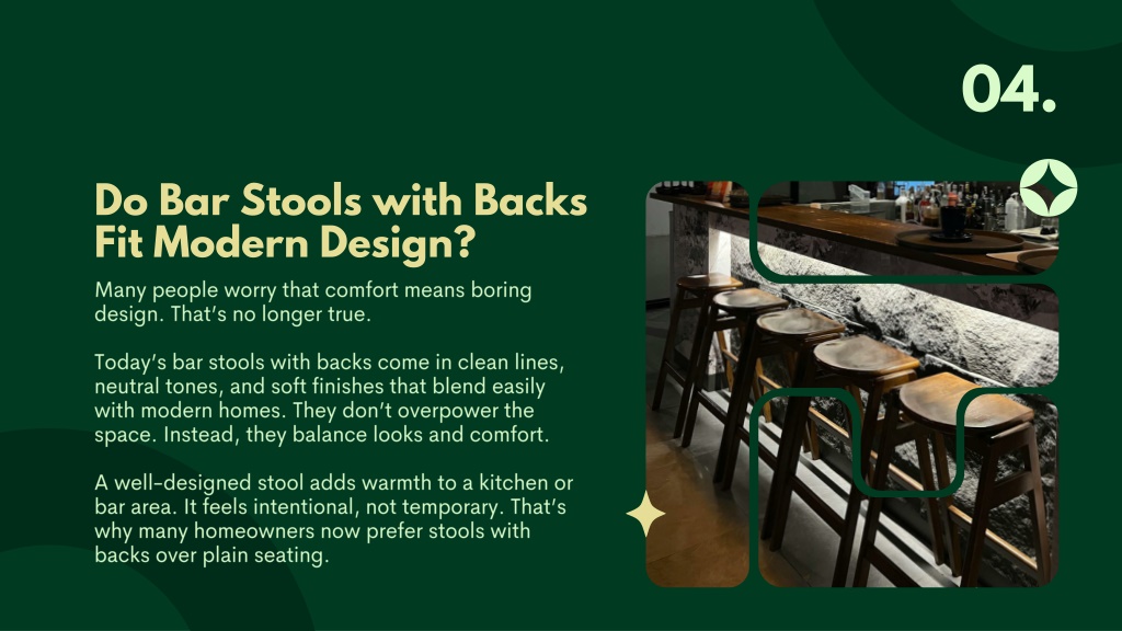 04. Do Bar Stools with Backs Fit Modern Design? Many people worry that comfort means boring design. That’s no longer true. Today’s bar stools with backs come in clean lines, neutral tones, and soft finishes that blend easily with modern homes. They don’t overpower the space. Instead, they balance looks and comfort. A well-designed stool adds warmth to a kitchen or bar area. It feels intentional, not temporary. That’s why many homeowners now prefer stools with backs over plain seating.