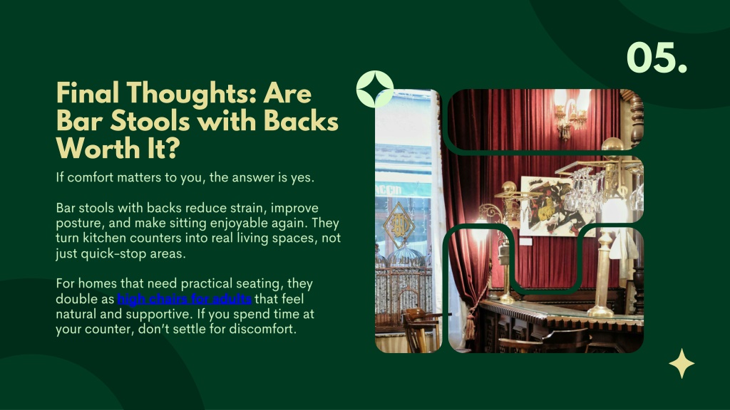 05. Final Thoughts: Are Bar Stools with Backs Worth It? If comfort matters to you, the answer is yes. Bar stools with backs reduce strain, improve posture, and make sitting enjoyable again. They turn kitchen counters into real living spaces, not just quick-stop areas. For homes that need practical seating, they double as high chairs for adults that feel natural and supportive. If you spend time at your counter, don’t settle for discomfort.