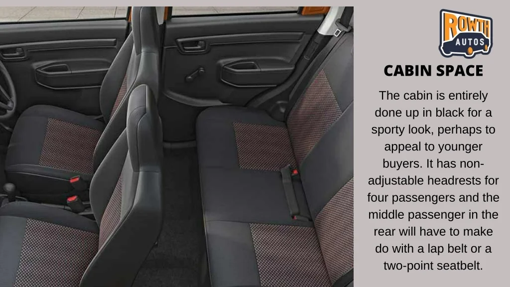 CABIN SPACE The cabin is entirely done up in black for a sporty look, perhaps to appeal to younger buyers. It has non- adjustable headrests for four passengers and the middle passenger in the rear will have to make do with a lap belt or a two-point seatbelt.