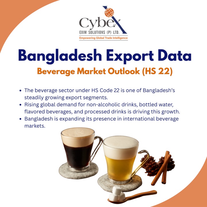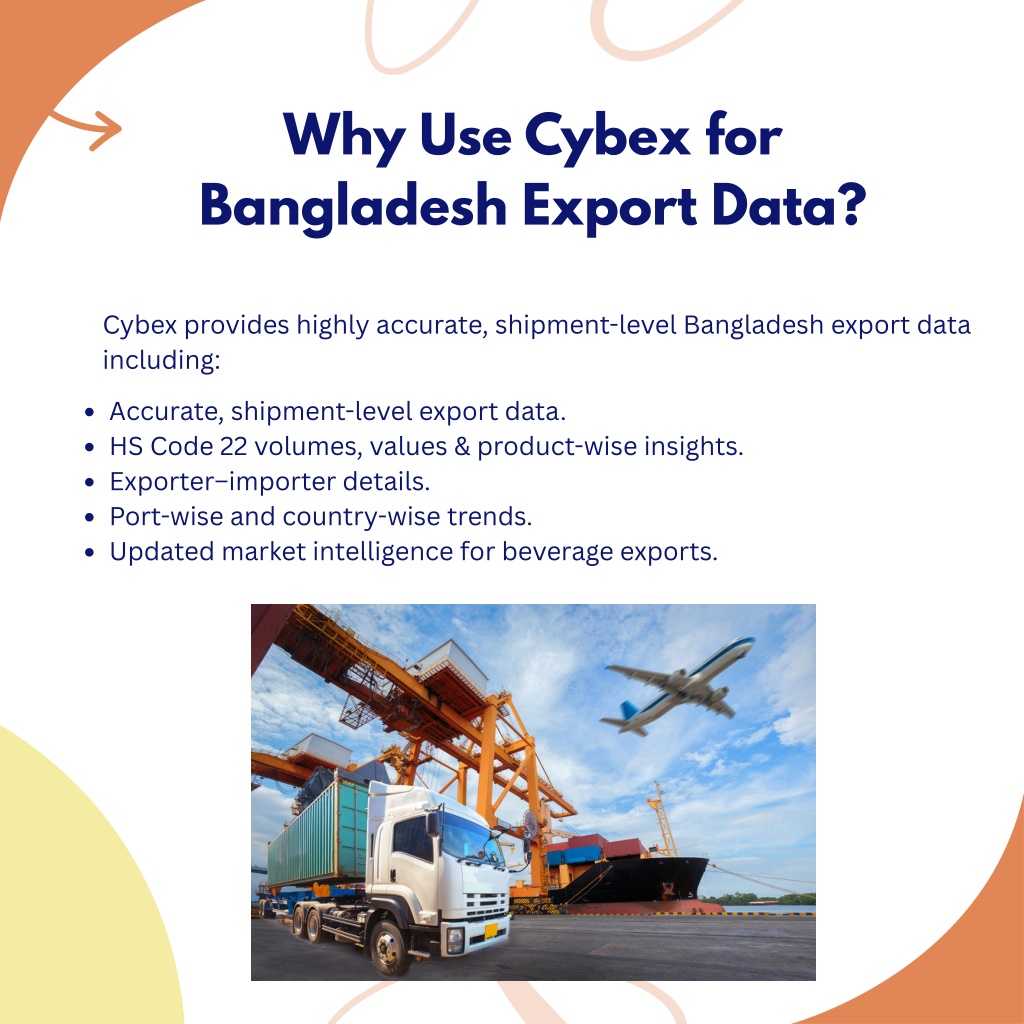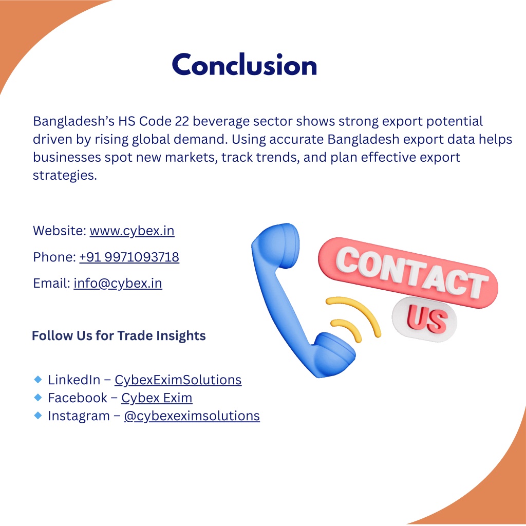 7. Conclusion Bangladesh’s HS Code 22 beverage sector shows strong export potential driven by rising global demand. Using accurate Bangladesh export data helps businesses spot new markets, track trends, and plan effective export strategies. Website: www.cybex.in Phone: +91 9971093718 Email: info@cybex.in Follow Us for Trade Insights ? LinkedIn – CybexEximSolutions ? Facebook – Cybex Exim ? Instagram – @cybexeximsolutions