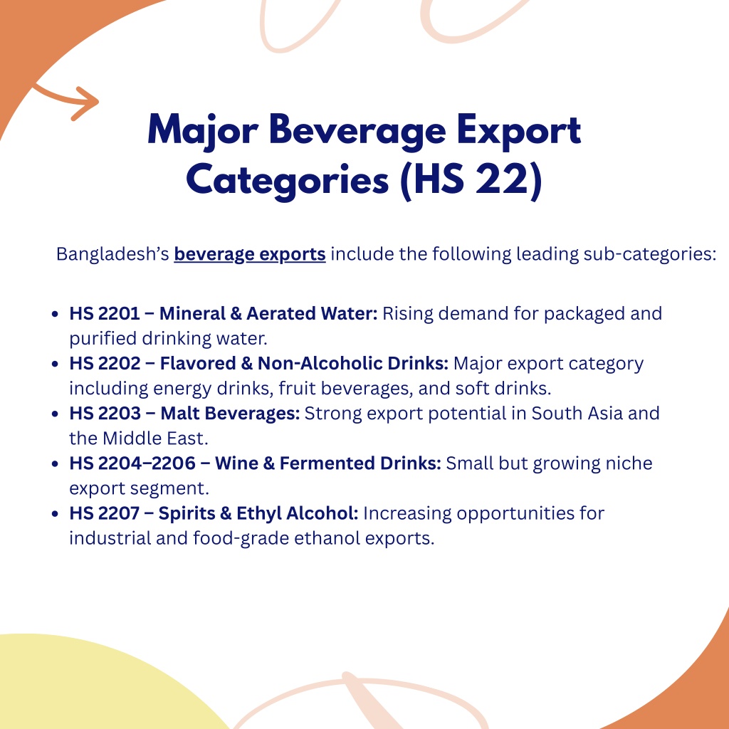 4. Major Beverage Export Categories (HS 22) Bangladesh’s beverage exports include the following leading sub-categories: HS 2201 – Mineral & Aerated Water: Rising demand for packaged and purified drinking water. HS 2202 – Flavored & Non-Alcoholic Drinks: Major export category including energy drinks, fruit beverages, and soft drinks. HS 2203 – Malt Beverages: Strong export potential in South Asia and the Middle East. HS 2204–2206 – Wine & Fermented Drinks: Small but growing niche export segment. HS 2207 – Spirits & Ethyl Alcohol: Increasing opportunities for industrial and food-grade ethanol exports.