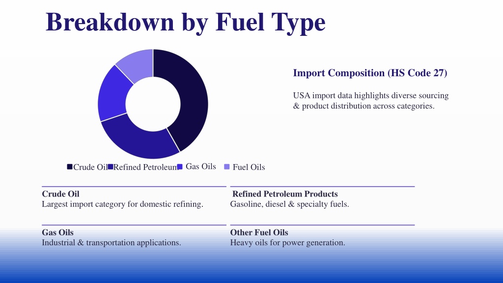 Breakdown by Fuel Type Import Composition (HS Code 27) USA import data highlights diverse sourcing & product distribution across categories. Gas Oils Crude Oil Refined Petroleum Fuel Oils Refined Petroleum Products Crude Oil Largest import category for domestic refining. Gasoline, diesel & specialty fuels. Gas Oils Other Fuel Oils Industrial & transportation applications. Heavy oils for power generation.