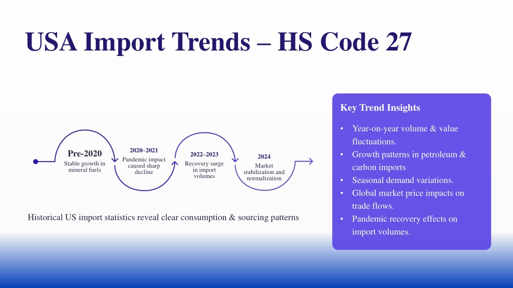 Overview of USA Import Data What This Report Covers Import Volume & Value Total mineral fuels imports into USA. Multi-Year Trends Historical patterns & market shifts. Source Markets Key exporting countries analysis. HS Code 27 Data Comprehensive trade statistics.