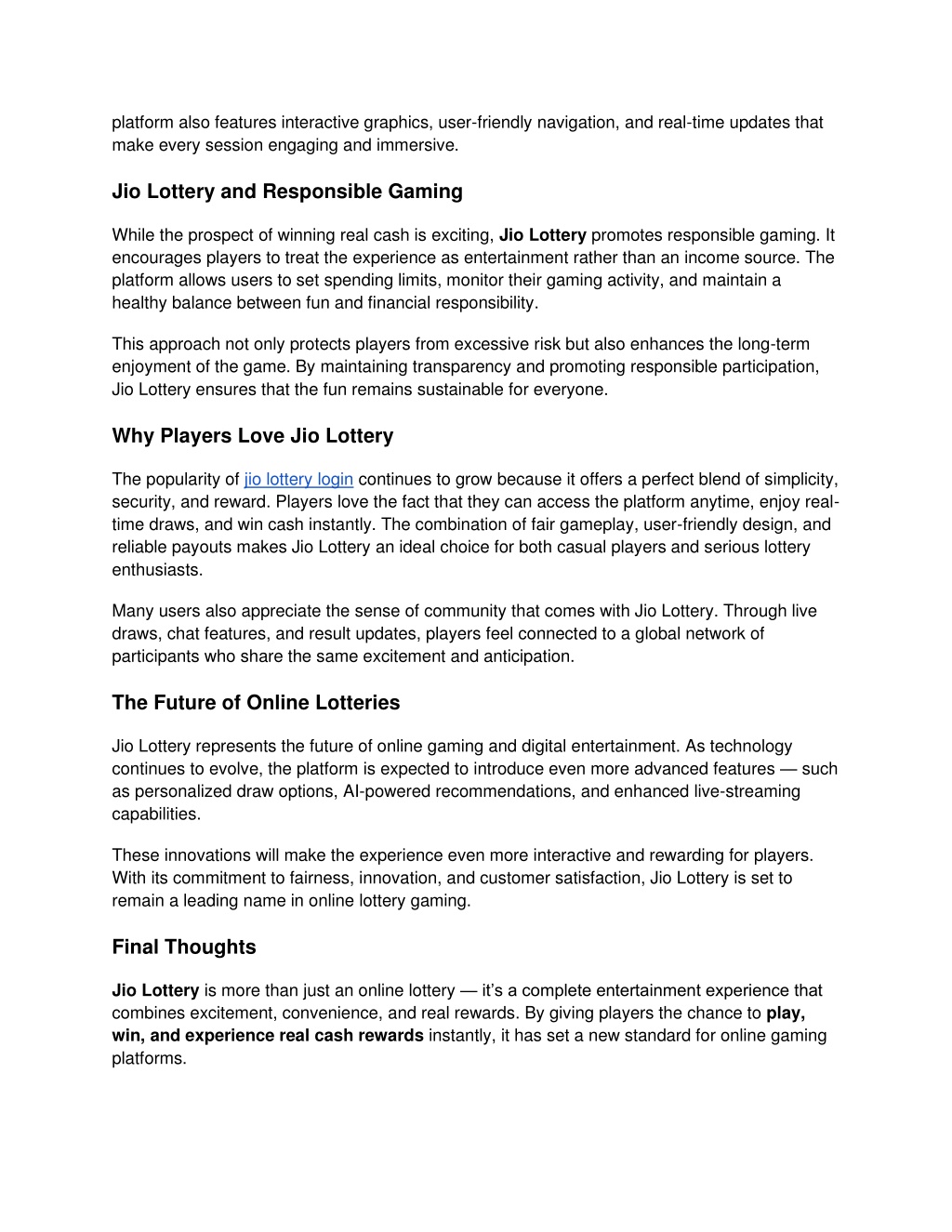 platform also features interactive graphics, user-friendly navigation, and real-time updates that make every session engaging and immersive. Jio Lottery and Responsible Gaming While the prospect of winning real cash is exciting, Jio Lottery promotes responsible gaming. It encourages players to treat the experience as entertainment rather than an income source. The platform allows users to set spending limits, monitor their gaming activity, and maintain a healthy balance between fun and financial responsibility. This approach not only protects players from excessive risk but also enhances the long-term enjoyment of the game. By maintaining transparency and promoting responsible participation, Jio Lottery ensures that the fun remains sustainable for everyone. Why Players Love Jio Lottery The popularity of jio lottery login continues to grow because it offers a perfect blend of simplicity, security, and reward. Players love the fact that they can access the platform anytime, enjoy real- time draws, and win cash instantly. The combination of fair gameplay, user-friendly design, and reliable payouts makes Jio Lottery an ideal choice for both casual players and serious lottery enthusiasts. Many users also appreciate the sense of community that comes with Jio Lottery. Through live draws, chat features, and result updates, players feel connected to a global network of participants who share the same excitement and anticipation. The Future of Online Lotteries Jio Lottery represents the future of online gaming and digital entertainment. As technology continues to evolve, the platform is expected to introduce even more advanced features — such as personalized draw options, AI-powered recommendations, and enhanced live-streaming capabilities. These innovations will make the experience even more interactive and rewarding for players. With its commitment to fairness, innovation, and customer satisfaction, Jio Lottery is set to remain a leading name in online lottery gaming. Final Thoughts Jio Lottery is more than just an online lottery —it’s a complete entertainment experience that combines excitement, convenience, and real rewards. By giving players the chance to play, win, and experience real cash rewards instantly, it has set a new standard for online gaming platforms.
