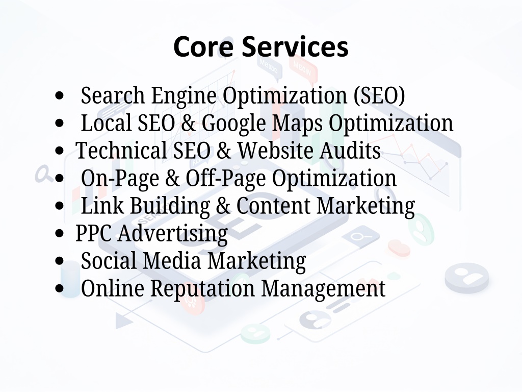 Core Services Search Engine Optimization (SEO) Local SEO & Google Maps Optimization Technical SEO & Website Audits On-Page & Off-Page Optimization Link Building & Content Marketing PPC Advertising Social Media Marketing Online Reputation Management