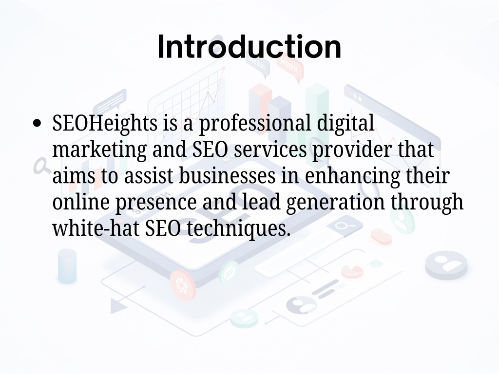 Introduction SEOHeights is a professional digital marketing and SEO services provider that aims to assist businesses in enhancing their online presence and lead generation through white-hat SEO techniques.