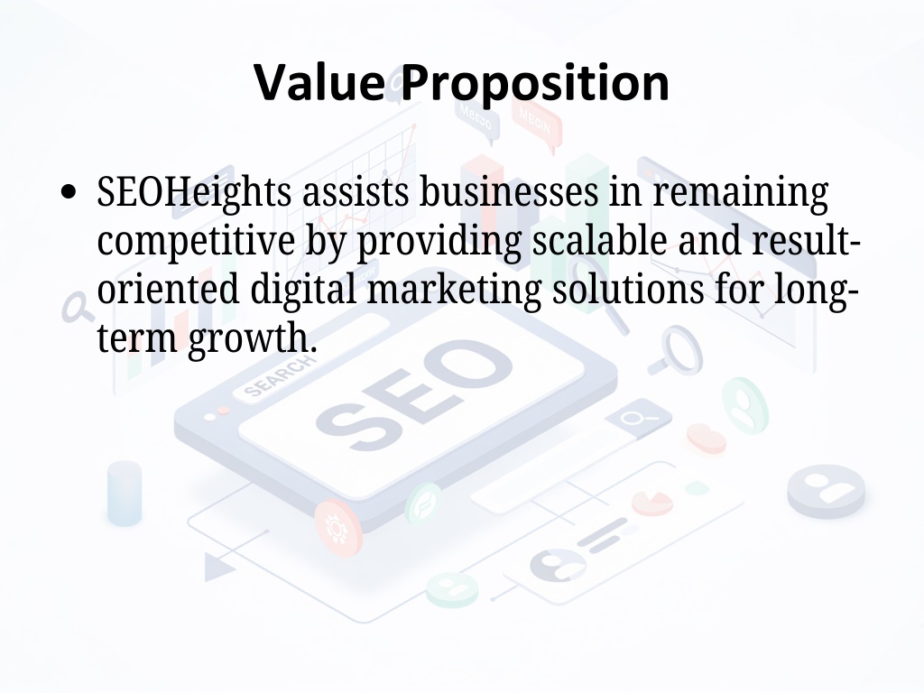 Value Proposition SEOHeights assists businesses in remaining competitive by providing scalable and result- oriented digital marketing solutions for long- term growth.