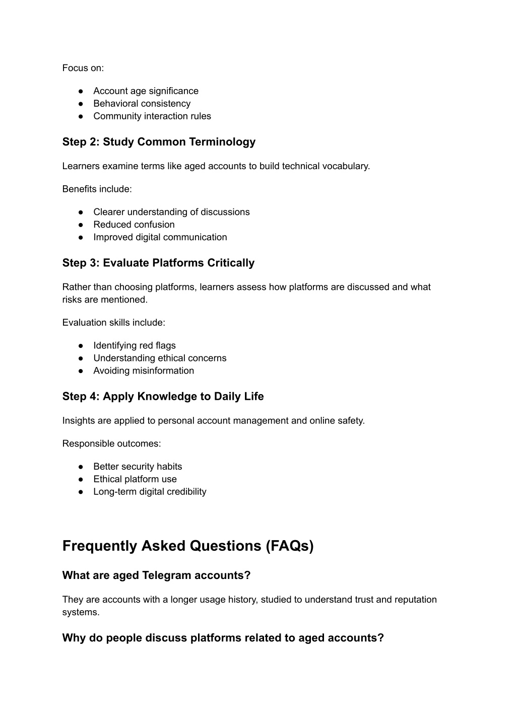 5. Focus on: ● Account age significance ● Behavioral consistency ● Community interaction rules Step 2: Study Common Terminology Learners examine terms like aged accounts to build technical vocabulary. Benefits include: ● Clearer understanding of discussions ● Reduced confusion ● Improved digital communication Step 3: Evaluate Platforms Critically Rather than choosing platforms, learners assess how platforms are discussed and what risks are mentioned. Evaluation skills include: ● Identifying red flags ● Understanding ethical concerns ● Avoiding misinformation Step 4: Apply Knowledge to Daily Life Insights are applied to personal account management and online safety. Responsible outcomes: ● Better security habits ● Ethical platform use ● Long-term digital credibility Frequently Asked Questions (FAQs) What are aged Telegram accounts? They are accounts with a longer usage history, studied to understand trust and reputation systems. Why do people discuss platforms related to aged accounts?