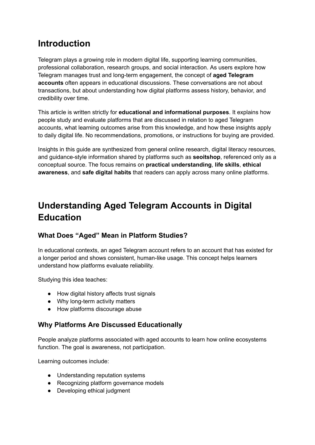 2. Introduction Telegram plays a growing role in modern digital life, supporting learning communities, professional collaboration, research groups, and social interaction. As users explore how Telegram manages trust and long-term engagement, the concept of aged Telegram accounts often appears in educational discussions. These conversations are not about transactions, but about understanding how digital platforms assess history, behavior, and credibility over time. This article is written strictly for educational and informational purposes. It explains how people study and evaluate platforms that are discussed in relation to aged Telegram accounts, what learning outcomes arise from this knowledge, and how these insights apply to daily digital life. No recommendations, promotions, or instructions for buying are provided. Insights in this guide are synthesized from general online research, digital literacy resources, and guidance-style information shared by platforms such as seoitshop, referenced only as a conceptual source. The focus remains on practical understanding, life skills, ethical awareness, and safe digital habits that readers can apply across many online platforms. Understanding Aged Telegram Accounts in Digital Education What Does “Aged” Mean in Platform Studies? In educational contexts, an aged Telegram account refers to an account that has existed for a longer period and shows consistent, human-like usage. This concept helps learners understand how platforms evaluate reliability. Studying this idea teaches: ● How digital history affects trust signals ● Why long-term activity matters ● How platforms discourage abuse Why Platforms Are Discussed Educationally People analyze platforms associated with aged accounts to learn how online ecosystems function. The goal is awareness, not participation. Learning outcomes include: ● Understanding reputation systems ● Recognizing platform governance models ● Developing ethical judgment