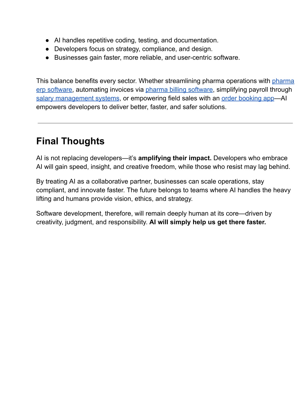 ● AI handles repetitive coding, testing, and documentation. ● Developers focus on strategy, compliance, and design. ● Businesses gain faster, more reliable, and user-centric software. This balance benefits every sector. Whether streamlining pharma operations with pharma erp software, automating invoices via pharma billing software, simplifying payroll through salary management systems, or empowering field sales with an order booking app—AI empowers developers to deliver better, faster, and safer solutions. Final Thoughts AI is not replacing developers—it’s amplifying their impact. Developers who embrace AI will gain speed, insight, and creative freedom, while those who resist may lag behind. By treating AI as a collaborative partner, businesses can scale operations, stay compliant, and innovate faster. The future belongs to teams where AI handles the heavy lifting and humans provide vision, ethics, and strategy. Software development, therefore, will remain deeply human at its core—driven by creativity, judgment, and responsibility. AI will simply help us get there faster.