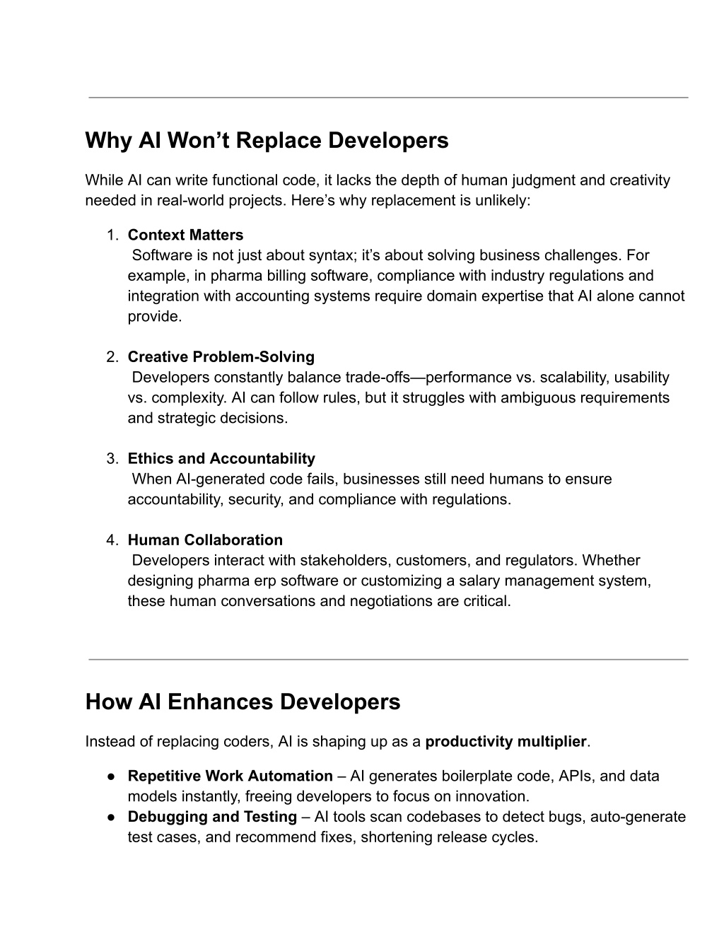 Why AI Won’t Replace Developers While AI can write functional code, it lacks the depth of human judgment and creativity needed in real-world projects. Here’s why replacement is unlikely: 1. Context Matters Software is not just about syntax; it’s about solving business challenges. For example, in pharma billing software, compliance with industry regulations and integration with accounting systems require domain expertise that AI alone cannot provide. 2. Creative Problem-Solving Developers constantly balance trade-offs—performance vs. scalability, usability vs. complexity. AI can follow rules, but it struggles with ambiguous requirements and strategic decisions. 3. Ethics and Accountability When AI-generated code fails, businesses still need humans to ensure accountability, security, and compliance with regulations. 4. Human Collaboration Developers interact with stakeholders, customers, and regulators. Whether designing pharma erp software or customizing a salary management system, these human conversations and negotiations are critical. How AI Enhances Developers Instead of replacing coders, AI is shaping up as a productivity multiplier. ● Repetitive Work Automation – AI generates boilerplate code, APIs, and data models instantly, freeing developers to focus on innovation. ● Debugging and Testing – AI tools scan codebases to detect bugs, auto-generate test cases, and recommend fixes, shortening release cycles.