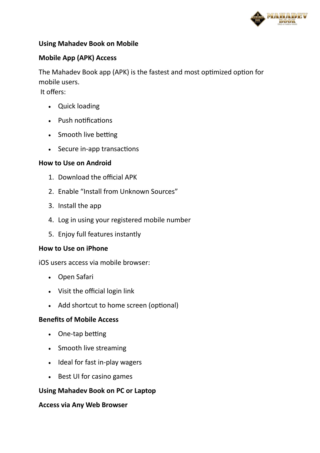 Using Mahadev Book on Mobile Mobile App (APK) Access The Mahadev Book app (APK) is the fastest and most optimized option for mobile users. It offers: •Quick loading •Push notifications •Smooth live betting •Secure in-app transactions How to Use on Android 1.Download the official APK 2.Enable “Install from Unknown Sources” 3.Install the app 4.Log in using your registered mobile number 5.Enjoy full features instantly How to Use on iPhone iOS users access via mobile browser: •Open Safari •Visit the official login link •Add shortcut to home screen (optional) Benefits of Mobile Access •One-tap betting •Smooth live streaming •Ideal for fast in-play wagers •Best UI for casino games Using Mahadev Book on PC or Laptop Access via Any Web Browser