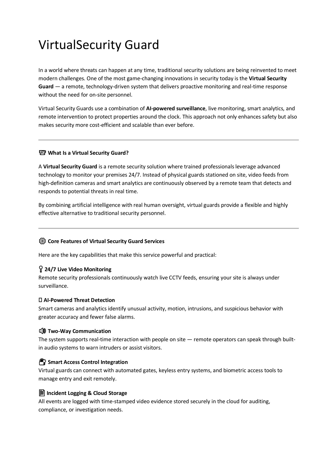 VirtualSecurity Guard In a world where threats can happen at any time, traditional security solutions are being reinvented to meet modern challenges. One of the most game-changing innovations in security today is the Virtual Security Guard— a remote, technology-driven system that delivers proactive monitoring and real-time response without the need for on-site personnel. Virtual Security Guards use a combination of AI-powered surveillance, live monitoring, smart analytics, and remote intervention to protect properties around the clock. This approach not only enhances safety but also makes security more cost-efficient and scalable than ever before. ? ? What Is a Virtual Security Guard? A Virtual Security Guard is a remote security solution where trained professionals leverage advanced technology to monitor your premises 24/7. Instead of physical guards stationed on site, video feeds from high-definition cameras and smart analytics are continuously observed by a remote team that detects and responds to potential threats in real time. By combining artificial intelligence with real human oversight, virtual guards provide a flexible and highly effective alternative to traditional security personnel. ⚙️ ⚙️ Core Features of Virtual Security Guard Services Here are the key capabilities that make this service powerful and practical: ? ? 24/7 Live Video Monitoring Remote security professionals continuously watch live CCTV feeds, ensuring your site is always under surveillance. ? ? AI-Powered Threat Detection Smart cameras and analytics identify unusual activity, motion, intrusions, and suspicious behavior with greater accuracy and fewer false alarms. ? ? Two-Way Communication The system supports real-time interaction with people on site — remote operators can speak through built- in audio systems to warn intruders or assist visitors. ? ? Smart Access Control Integration Virtual guards can connect with automated gates, keyless entry systems, and biometric access tools to manage entry and exit remotely. ? ? Incident Logging & Cloud Storage All events are logged with time-stamped video evidence stored securely in the cloud for auditing, compliance, or investigation needs.