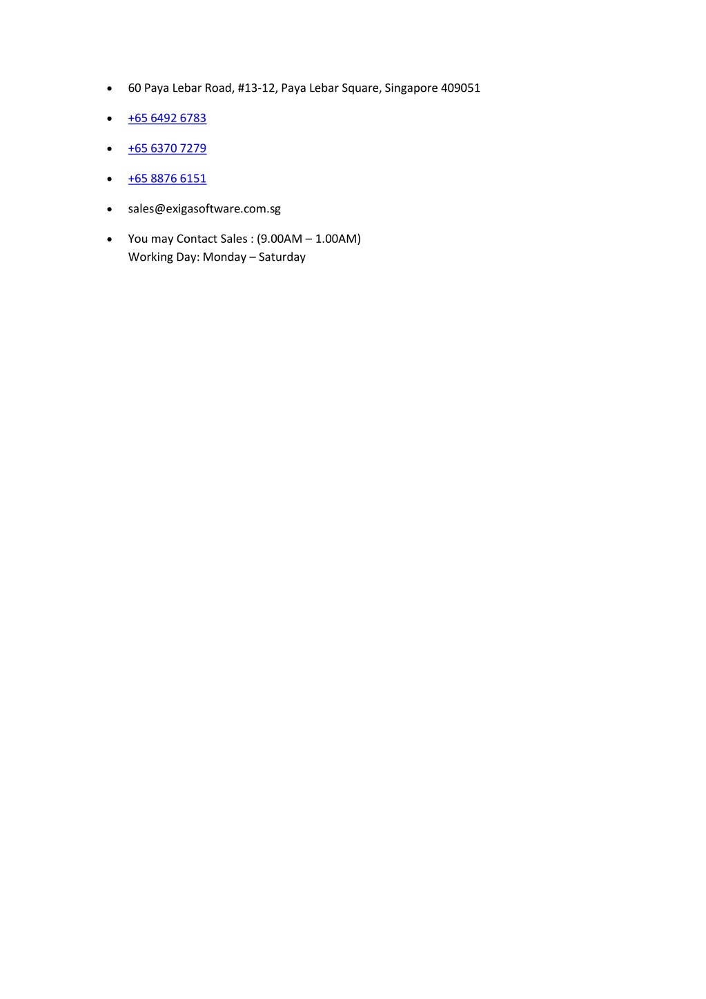 60 Paya Lebar Road, #13-12, Paya Lebar Square, Singapore 409051 +65 6492 6783 +65 6370 7279 +65 8876 6151 sales@exigasoftware.com.sg You may Contact Sales : (9.00AM – 1.00AM) Working Day: Monday – Saturday