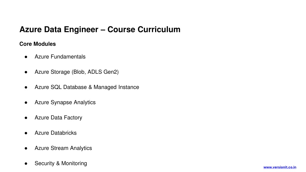 Azure Data Engineer – Course Curriculum Core Modules • Azure Fundamentals • Azure Storage (Blob, ADLS Gen2) • Azure SQL Database & Managed Instance • Azure Synapse Analytics • Azure Data Factory • Azure Databricks • Azure Stream Analytics • Security & Monitoring www.versionit.co.in