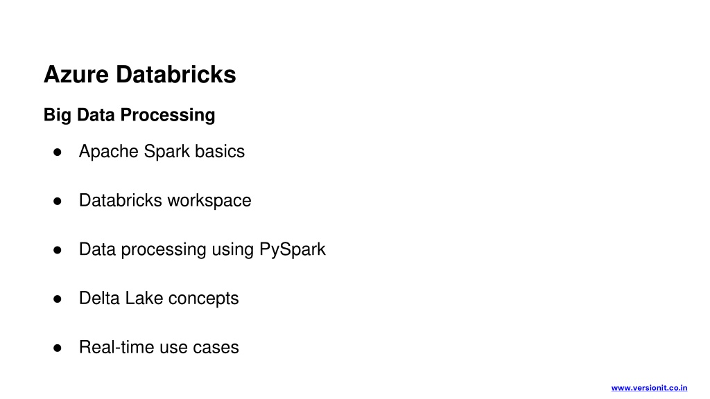 Azure Databricks Big Data Processing • Apache Spark basics • Databricks workspace • Data processing using PySpark • Delta Lake concepts • Real-time use cases www.versionit.co.in