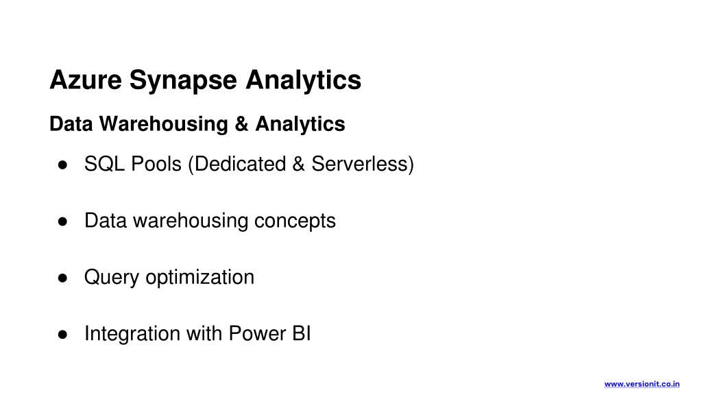 Azure Synapse Analytics Data Warehousing & Analytics • SQL Pools (Dedicated & Serverless) • Data warehousing concepts • Query optimization • Integration with Power BI www.versionit.co.in