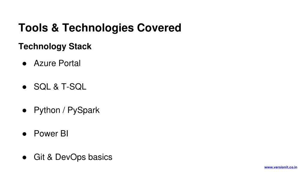 Tools & Technologies Covered Technology Stack • Azure Portal • SQL & T-SQL • Python / PySpark • Power BI • Git & DevOps basics www.versionit.co.in