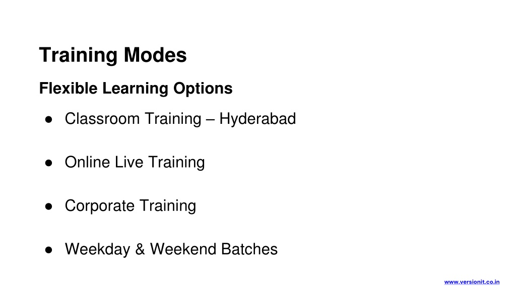 Training Modes Flexible Learning Options • Classroom Training – Hyderabad • Online Live Training • Corporate Training • Weekday & Weekend Batches www.versionit.co.in