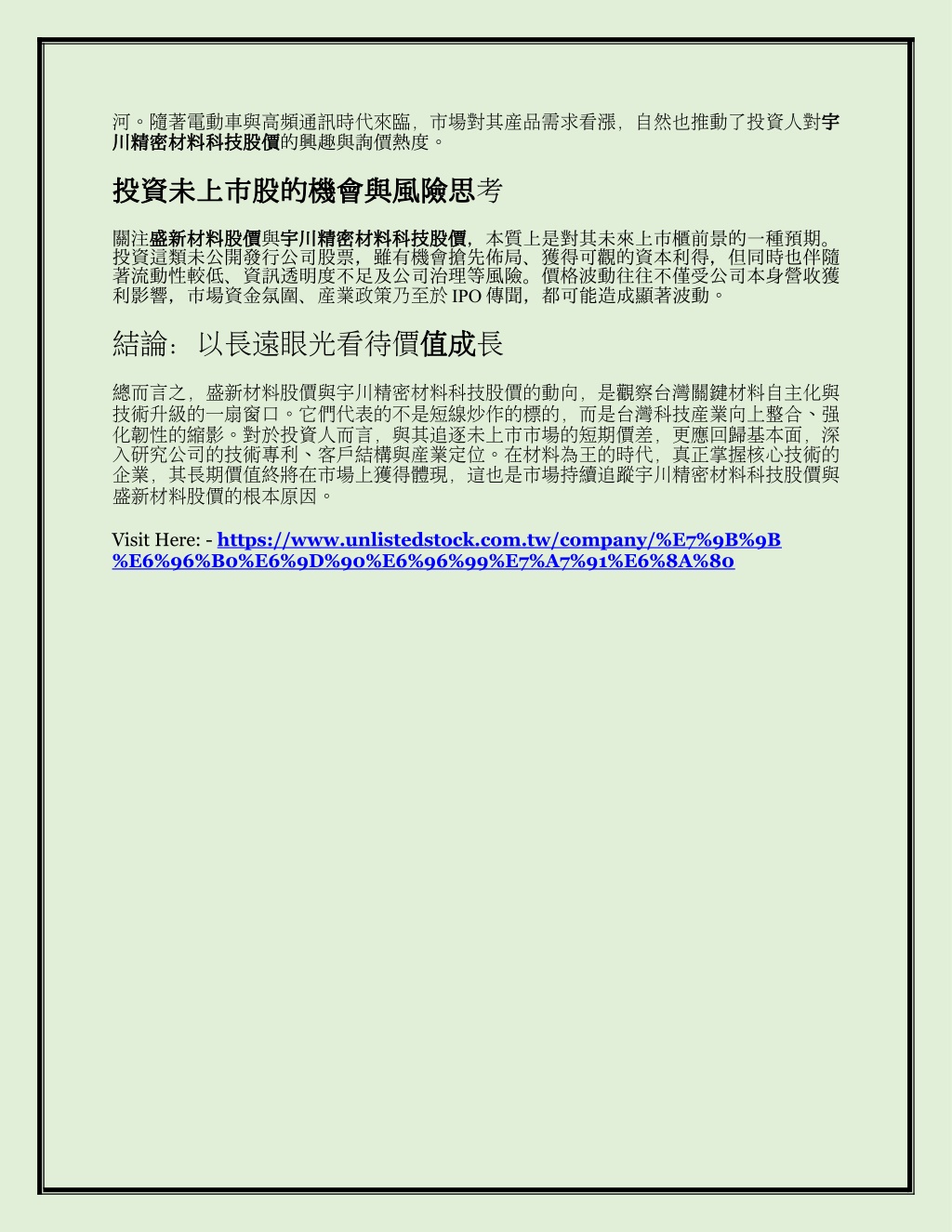 河。隨著電動車與高頻通訊時代來臨,市場對其產品需求看漲,自然也推動了投資人對宇河。隨著電動車與高頻通訊時代來臨,市場對其產品需求看漲,自然也推動了投資人對宇 川精密材料科技股價 川精密材料科技股價的興趣與詢價熱度。 宇 投資未上市股的機會與風險思 投資未上市股的機會與風險思考 關注盛新材料股價 盛新材料股價與宇川精密材料科技股價 宇川精密材料科技股價,本質上是對其未來上市櫃前景的一種預期。 投資這類未公開發行公司股票,雖有機會搶先佈局、獲得可觀的資本利得,但同時也伴隨 著流動性較低、資訊透明度不足及公司治理等風險。價格波動往往不僅受公司本身營收獲 利影響,市場資金氛圍、產業政策乃至於IPO 傳聞,都可能造成顯著波動。 結論:以長遠眼光看待價值成 值成長 總而言之,盛新材料股價與宇川精密材料科技股價的動向,是觀察台灣關鍵材料自主化與 技術升級的一扇窗口。它們代表的不是短線炒作的標的,而是台灣科技產業向上整合、強 化韌性的縮影。對於投資人而言,與其追逐未上市市場的短期價差,更應回歸基本面,深 入研究公司的技術專利、客戶結構與產業定位。在材料為王的時代,真正掌握核心技術的 企業,其長期價值終將在市場上獲得體現,這也是市場持續追蹤宇川精密材料科技股價與 盛新材料股價的根本原因。 Visit Here: - https://www.unlistedstock.com.tw/company/%E7%9B%9B %E6%96%B0%E6%9D%90%E6%96%99%E7%A7%91%E6%8A%80