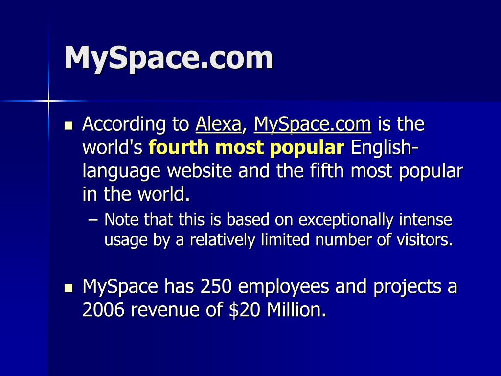 MySpace.com • According to Alexa, MySpace.com is the world's fourth most popular English-language website and the fifth most popular in the world. • Note that this is based on exceptionally intense usage by a relatively limited number of visitors. • MySpace has 250 employees and projects a 2006 revenue of $20 Million.