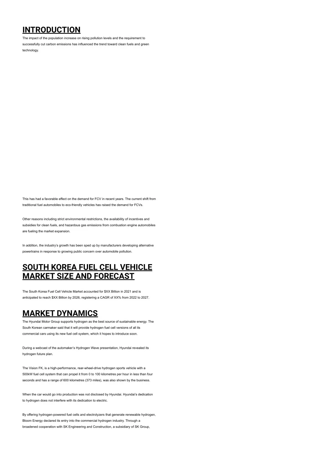 INTRODUCTION The impact of the population increase on rising pollution levels and the requirement to successfully cut carbon emissions has influenced the trend toward clean fuels and green technology. This has had a favorable effect on the demand for FCV in recent years. The current shift from traditional fuel automobiles to ecofriendly vehicles has raised the demand for FCVs. Other reasons including strict environmental restrictions, the availability of incentives and subsidies for clean fuels, and hazardous gas emissions from combustion engine automobiles are fueling the market expansion. In addition, the industry’s growth has been sped up by manufacturers developing alternative powertrains in response to growing public concern over automobile pollution. SOUTH KOREA FUEL CELL VEHICLE MARKET SIZE AND FORECAST The South Korea Fuel Cell Vehicle Market accounted for $XX Billion in 2021 and is anticipated to reach $XX Billion by 2026, registering a CAGR of XX% from 2022 to 2027. MARKET DYNAMICS The Hyundai Motor Group supports hydrogen as the best source of sustainable energy. The South Korean carmaker said that it will provide hydrogen fuel cell versions of all its commercial cars using its new fuel cell system, which it hopes to introduce soon. During a webcast of the automaker’s Hydrogen Wave presentation, Hyundai revealed its hydrogen future plan. The Vision FK, is a highperformance, rearwheeldrive hydrogen sports vehicle with a 500kW fuel cell system that can propel it from 0 to 100 kilometres per hour in less than four seconds and has a range of 600 kilometres (373 miles), was also shown by the business. When the car would go into production was not disclosed by Hyundai. Hyundai’s dedication to hydrogen does not interfere with its dedication to electric. By offering hydrogenpowered fuel cells and electrolyzers that generate renewable hydrogen, Bloom Energy declared its entry into the commercial hydrogen industry. Through a broadened cooperation with SK Engineering and Construction, a subsidiary of SK Group,