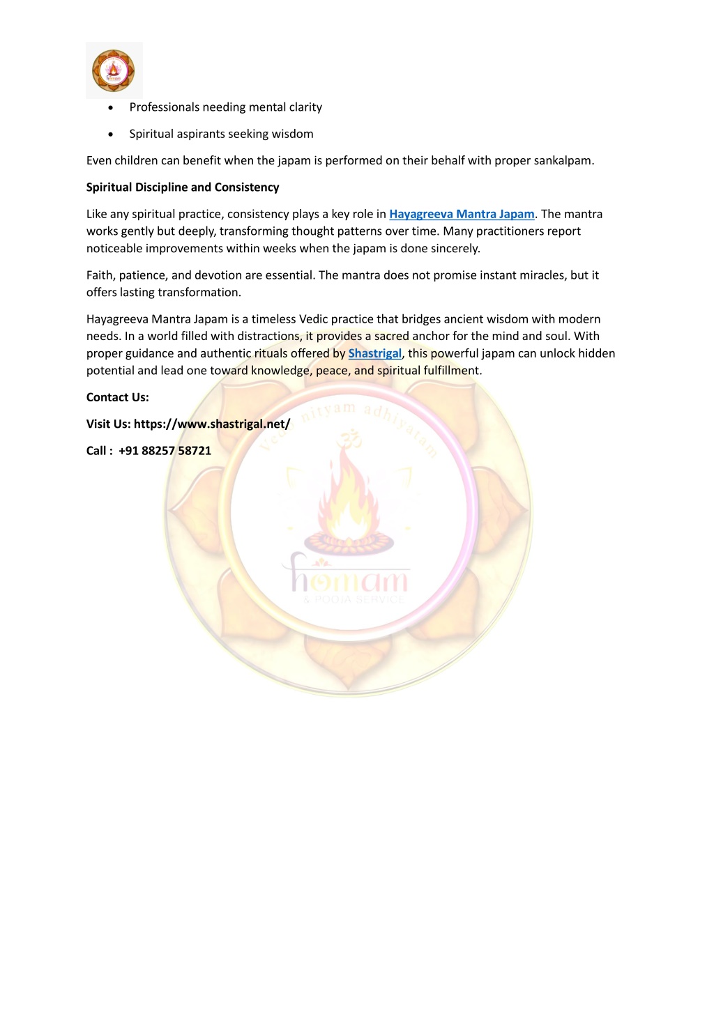Professionals needing mental clarity Spiritual aspirants seeking wisdom Even children can benefit when the japam is performed on their behalf with proper sankalpam. Spiritual Discipline and Consistency Like any spiritual practice, consistency plays a key role in Hayagreeva Mantra Japam. The mantra works gently but deeply, transforming thought patterns over time. Many practitioners report noticeable improvements within weeks when the japam is done sincerely. Faith, patience, and devotion are essential. The mantra does not promise instant miracles, but it offerslasting transformation. HayagreevaMantra Japam is a timeless Vedic practice that bridges ancient wisdom with modern needs. In a world filled with distractions, it provides a sacred anchor for the mind and soul. With proper guidance and authentic rituals offered by Shastrigal, this powerful japam can unlock hidden potential and lead one toward knowledge, peace, and spiritual fulfillment. Contact Us: Visit Us: https://www.shastrigal.net/ Call : +91 88257 58721