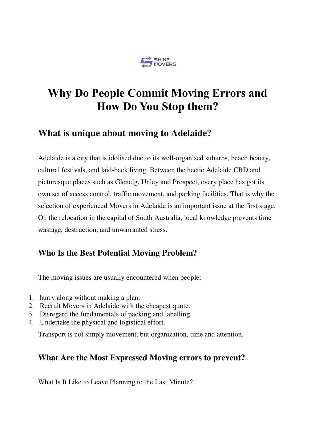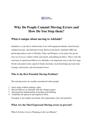 Adelaide is a city that is idolised due to its well-organised suburbs, beach beauty, cultural festivals, and laid-back living. Between the hectic Adelaide CBD and picturesque places such as Glenelg, Unley and Prospect, every place has got its own set of access control, traffic movement, and parking facilities. <br><br>Call Us Now at 0433 903 264<br><br>Email us at shinemovers58@gmail.com , info@shinemovers.com.au<br><br>Visit Our Website at https://shinemovers.com.au/