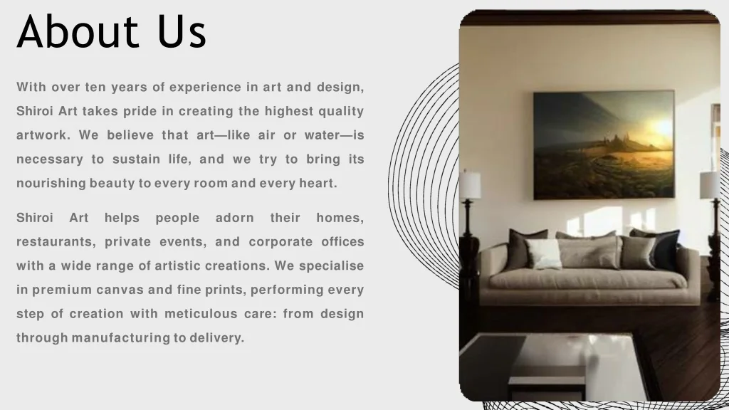 With over ten years of experience in art and design, Shiroi Art takes pride in creating the highest quality artwork. We believe that art—like air or water—is necessary to sustain life,and we try to bring its nourishingbeautytoeveryroomandeveryheart. ShiroiArthelpspeopleadorntheirhomes, restaurants, private events, and corporate offices withawiderangeofartisticcreations.Wespecialise inpremiumcanvasandfineprints,performingevery step of creation with meticulous care: from design throughmanufacturingtodelivery. AboutUs