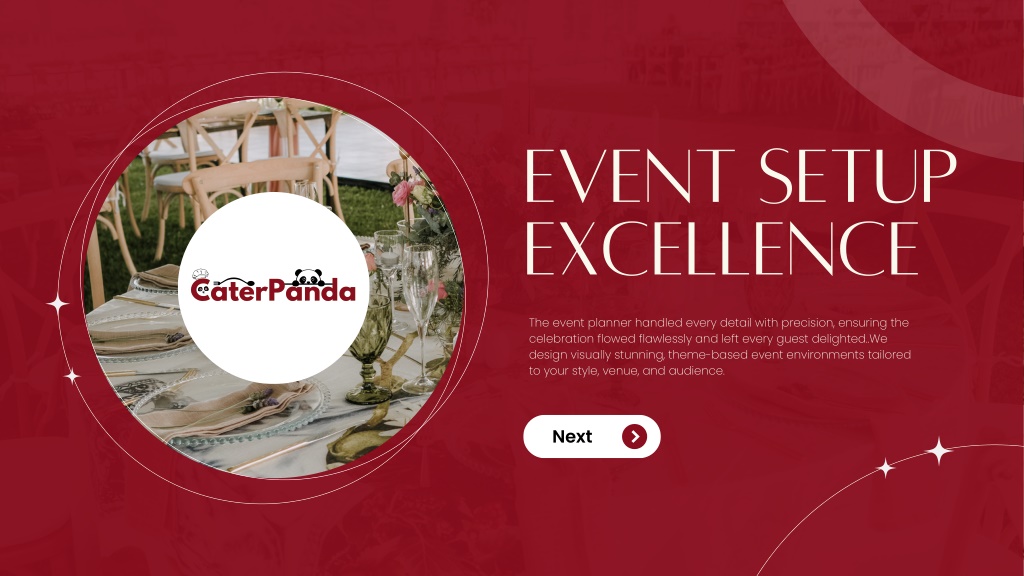 EVENT SETUP EXCELLENCE CaterPanda CaterPanda The event planner handled every detail with precision, ensuring the celebration flowed flawlessly and left every guest delighted..We design visually stunning, theme-based event environments tailored to your style, venue, and audience. Next