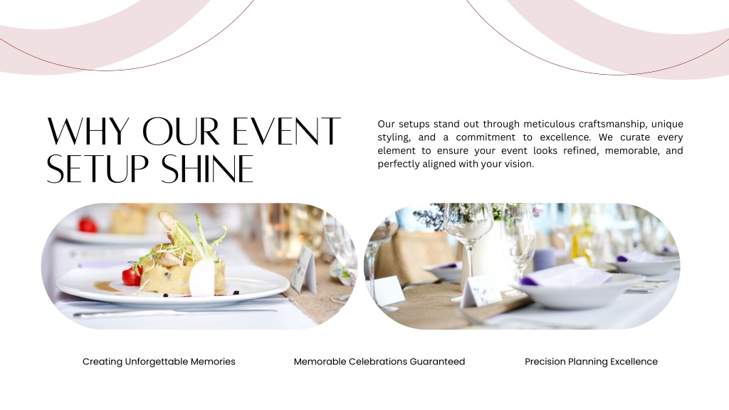 Why Our Event Setup Shine Our setups stand out through meticulous craftsmanship, unique styling, and a commitment to excellence. We curate every element to ensure your event looks refined, memorable, and perfectly aligned with your vision. Creating Unforgettable Memories Memorable Celebrations Guaranteed Precision Planning Excellence