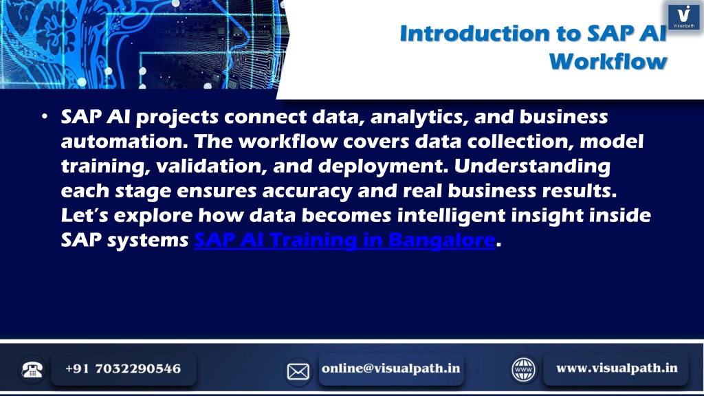 2. Introduction to SAP AI Workflow • SAP AI projects connect data, analytics, and business automation. The workflow covers data collection, model training, validation, and deployment. Understanding each stage ensures accuracy and real business results. Let’s explore how data becomes intelligent insight inside SAP systemsSAP AI Training in Bangalore.