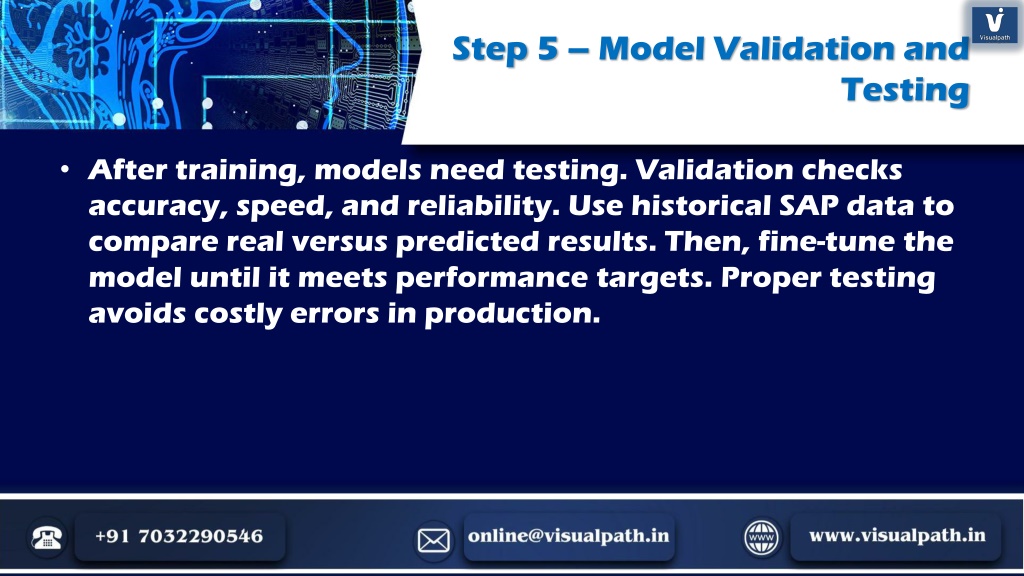 7. Step 5 – Model Validation and Testing • After training, models need testing. Validation checks accuracy, speed, and reliability. Use historical SAP data to compare real versus predicted results. Then, fine-tune the model until it meets performance targets. Proper testing avoids costly errors in production.