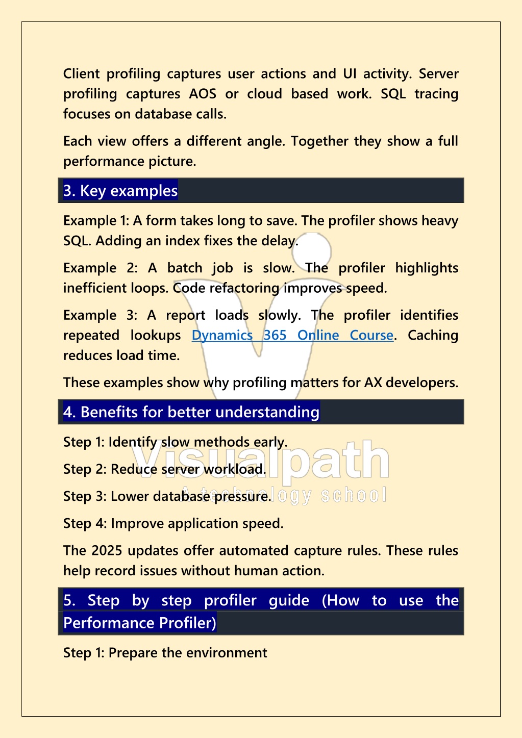 Client profiling captures user actions and UI activity. Server profiling captures AOS or cloud based work. SQL tracing focuses on database calls. Each view offers a different angle. Together they show a full performance picture. 3. Key examples Example 1: A form takes long to save. The profiler shows heavy SQL. Adding an index fixes the delay. Example 2: A batch job is slow. The profiler highlights inefficient loops. Code refactoring improves speed. Example 3: A report loads slowly. The profiler identifies repeated lookups Dynamics 365 Online Course. Caching reduces load time. These examples show why profiling matters for AX developers. 4. Benefits for better understanding Step 1: Identify slow methods early. Step 2: Reduce server workload. Step 3: Lower database pressure. Step 4: Improve application speed. The 2025 updates offer automated capture rules. These rules help record issues without human action. 5. Step by step profiler guide (How to use the Performance Profiler) Step 1: Prepare the environment
