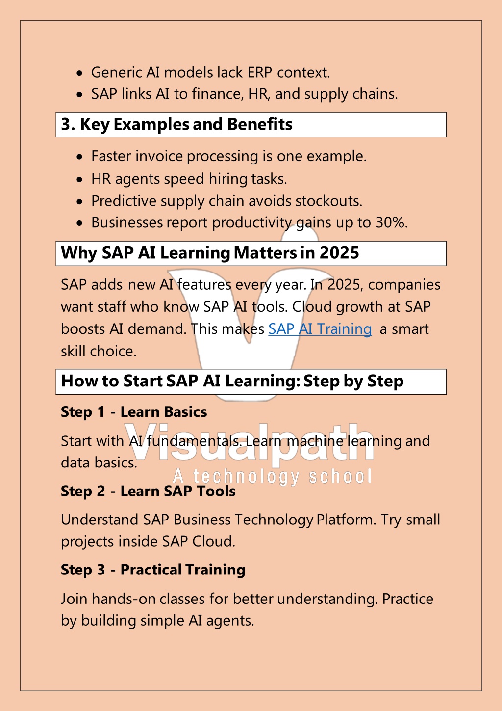 2. Generic AI models lack ERP context. SAP links AI to finance, HR, and supply chains. 3. Key Examples and Benefits Faster invoice processing is one example. HR agents speed hiring tasks. Predictive supply chain avoids stockouts. Businesses report productivity gains up to 30%. Why SAP AI Learning Matters in 2025 SAP adds new AI features every year. In 2025, companies want staff who know SAP AI tools. Cloud growth at SAP boosts AI demand. This makes SAP AI Training a smart skill choice. How to Start SAP AI Learning: Step by Step Step 1 - Learn Basics Start with AI fundamentals. Learn machine learning and data basics. Step 2 - Learn SAP Tools Understand SAP Business Technology Platform. Try small projects inside SAP Cloud. Step 3 - Practical Training Join hands-on classes for better understanding. Practice by building simple AI agents.