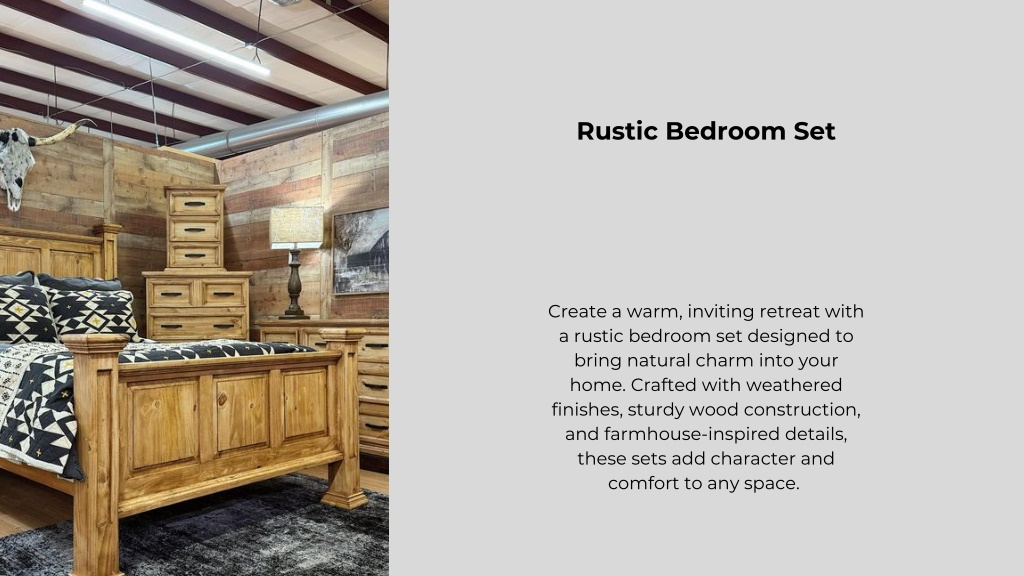 Rustic Bedroom Set Create a warm, inviting retreat with a rustic bedroom set designed to bring natural charm into your home. Crafted with weathered finishes, sturdy wood construction, and farmhouse-inspired details, these sets add character and comfort to any space.