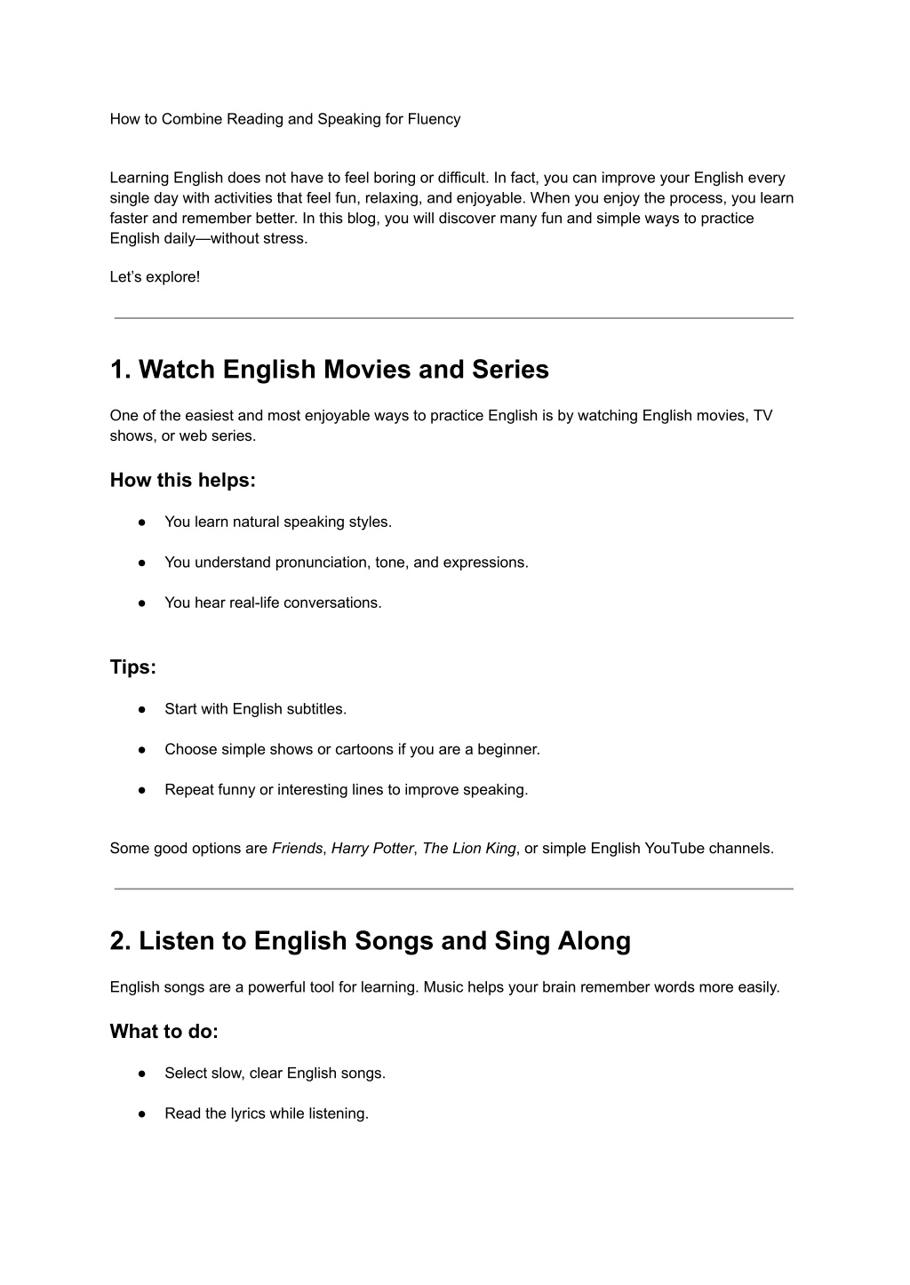 How to Combine Reading and Speaking for Fluency Learning English does not have to feel boring or difficult. In fact, you can improve your English every single day with activities that feel fun, relaxing, and enjoyable. When you enjoy the process, you learn faster and remember better. In this blog, you will discover many fun and simple ways to practice English daily—without stress. Let’s explore! 1. Watch English Movies and Series One of the easiest and most enjoyable ways to practice English is by watching English movies, TV shows, or web series. How this helps: ● You learn natural speaking styles. You understand pronunciation, tone, and expressions. You hear real-life conversations. ● ● Tips: ● Start with English subtitles. Choose simple shows or cartoons if you are a beginner. Repeat funny or interesting lines to improve speaking. ● ● Some good options are Friends, Harry Potter, The Lion King, or simple English YouTube channels. 2. Listen to English Songs and Sing Along English songs are a powerful tool for learning. Music helps your brain remember words more easily. What to do: ● Select slow, clear English songs. Read the lyrics while listening. ●