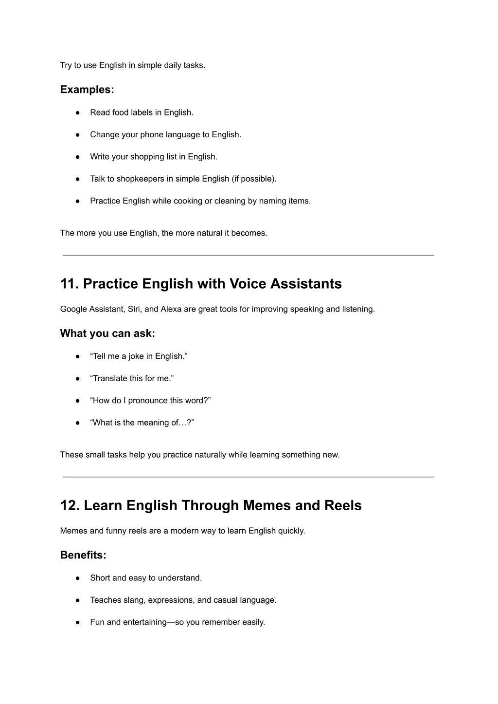 Try to use English in simple daily tasks. Examples: ● Read food labels in English. Change your phone language to English. Write your shopping list in English. Talk to shopkeepers in simple English (if possible). Practice English while cooking or cleaning by naming items. ● ● ● ● The more you use English, the more natural it becomes. 11. Practice English with Voice Assistants Google Assistant, Siri, and Alexa are great tools for improving speaking and listening. What you can ask: ● “Tell me a joke in English.” “Translate this for me.” “How do I pronounce this word?” “What is the meaning of…?” ● ● ● These small tasks help you practice naturally while learning something new. 12. Learn English Through Memes and Reels Memes and funny reels are a modern way to learn English quickly. Benefits: ● Short and easy to understand. Teaches slang, expressions, and casual language. Fun and entertaining—so you remember easily. ● ●