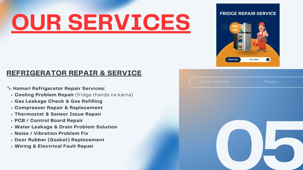 6. OUR SERVICES REFRIGERATOR REPAIR & SERVICE Studio Shodwe 05 Project. ? Hamari Refrigerator Repair Services: Cooling Problem Repair (fridge thanda na karna) Gas Leakage Check & Gas Refilling Compressor Repair & Replacement Thermostat & Sensor Issue Repair PCB / Control Board Repair Water Leakage & Drain Problem Solution Noise / Vibration Problem Fix Door Rubber (Gasket) Replacement Wiring & Electrical Fault Repair